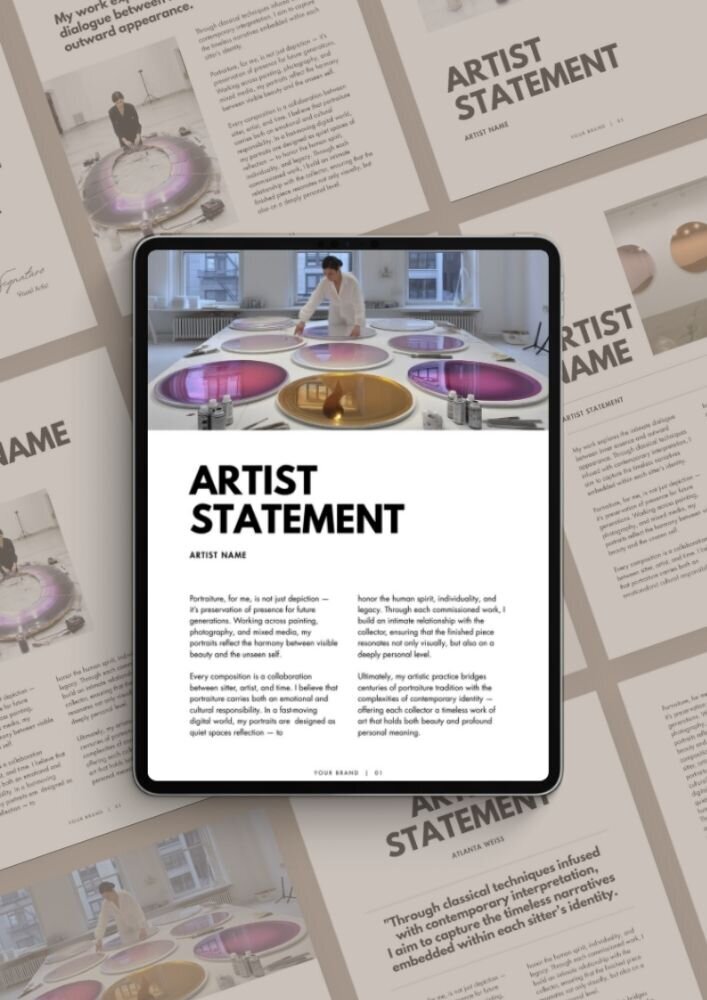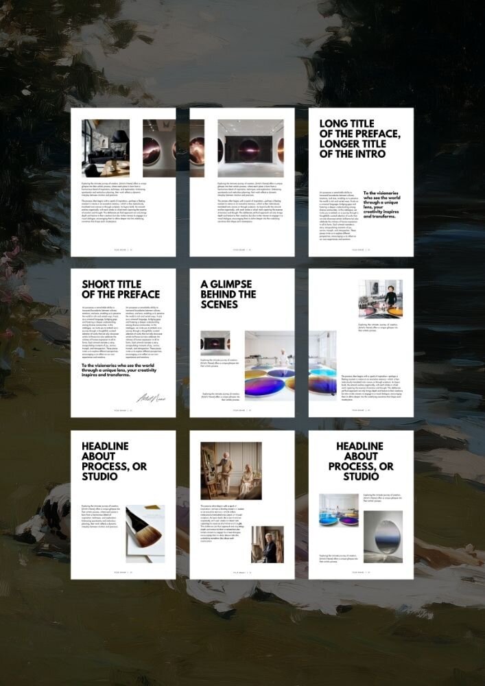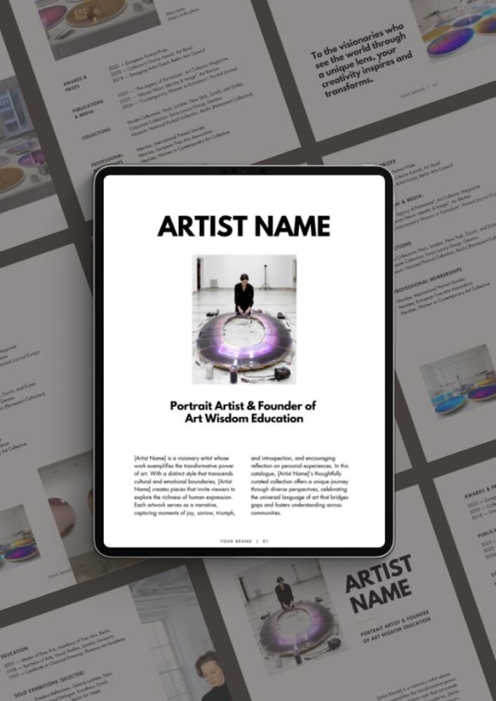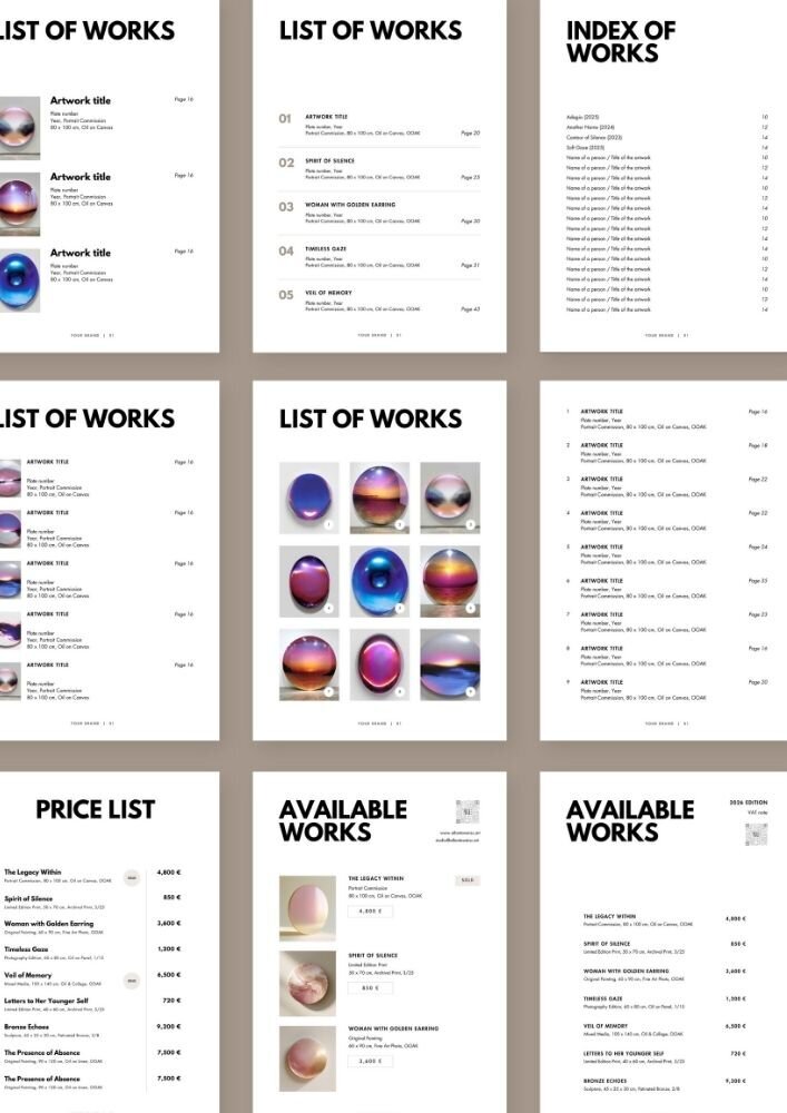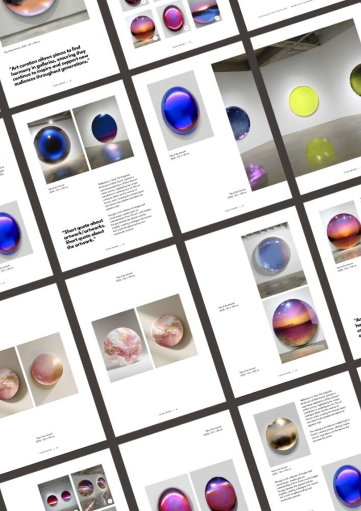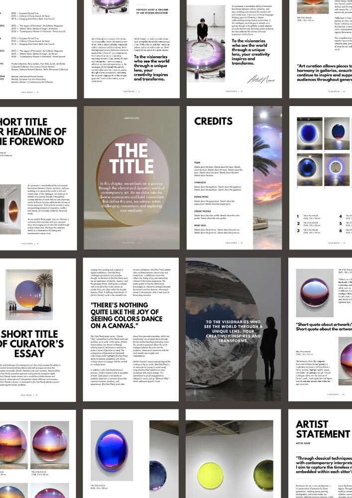 GALLERIES&AGENCIES: You can customise and reuse it yourself for your artists/clients forever. Reselling or sharing the templates themselves isn’t allowed.